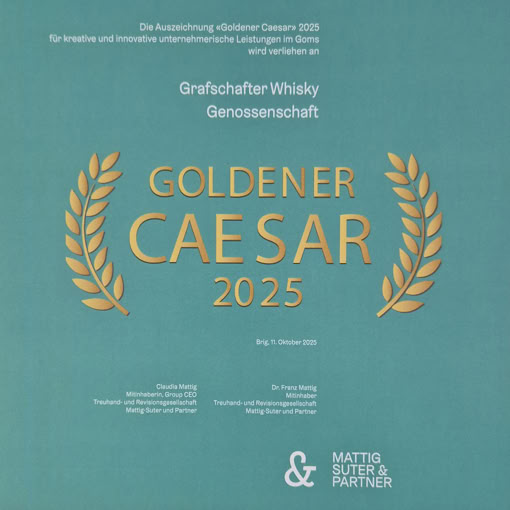 Unser Whisky wurde 2025 mit dem Goldenen Caesar für kreative und innovative unternehmerisches Leistungen im Goms ausgezeichnet